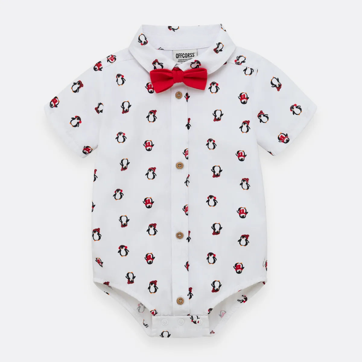 Body camisa manga corta en tejido plano silueta amplia con corbatín y broches en entrepierna. Comodidad y funcionalidad en una sola prenda.