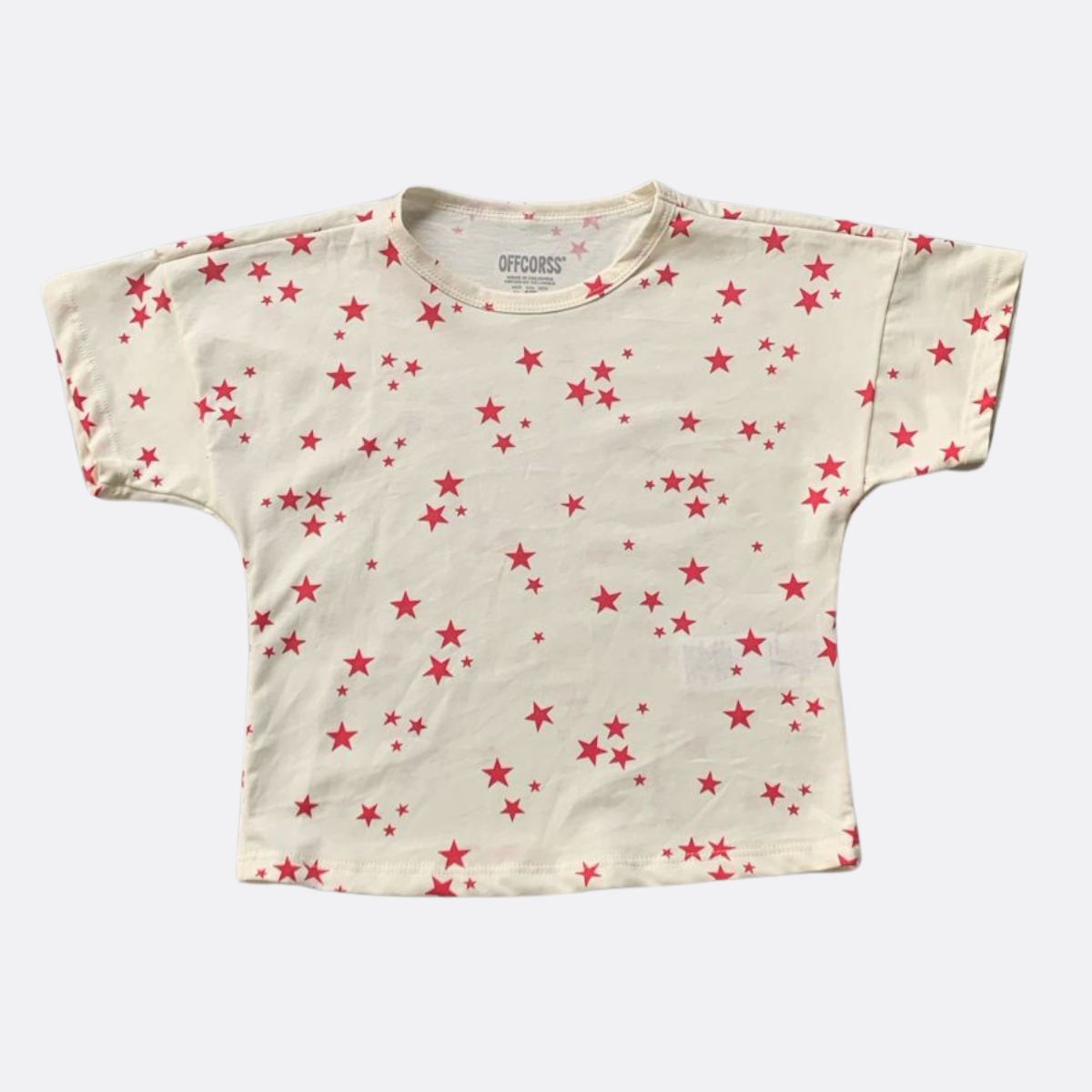 •Camiseta manga corta en tejido de punto, silueta amplia, manga con guardapolvo, textil estampado, composición: 99% algodón, 1% elastano.