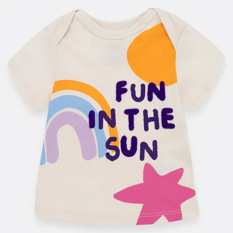 Camiseta manga corta en tejido de punto,Silueta clásica, Con hombros adelantados, tiene grafico con detalle bordado. Color arena.
