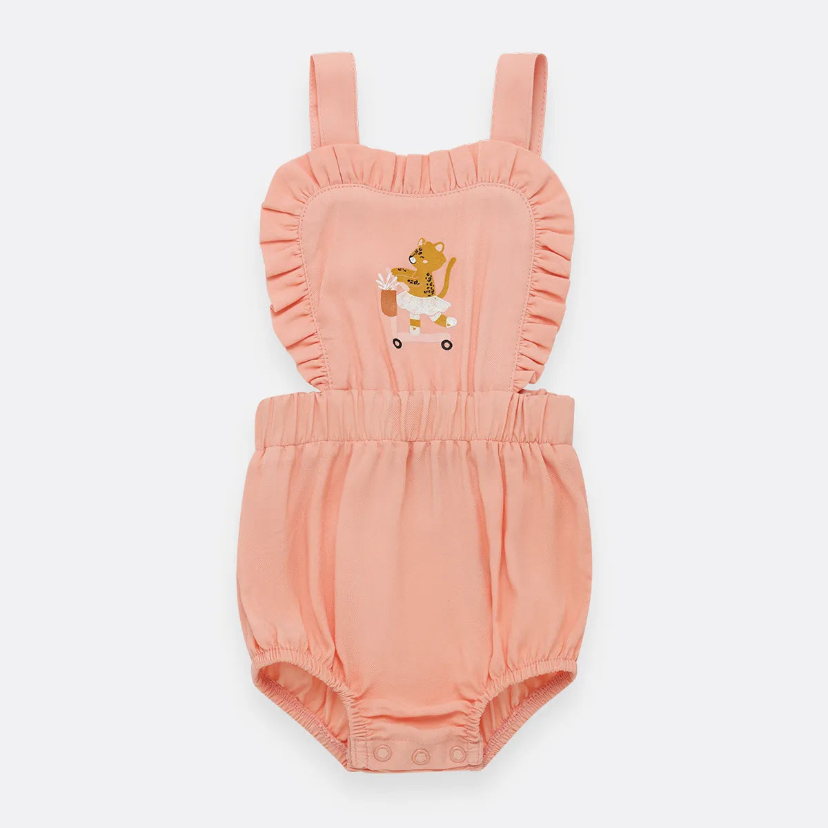 Enterizo en tejido plano silueta amplia con cargaderas ajustables, detalle brillante en estampado, color rosado, composición enterizo: 100% viscosa