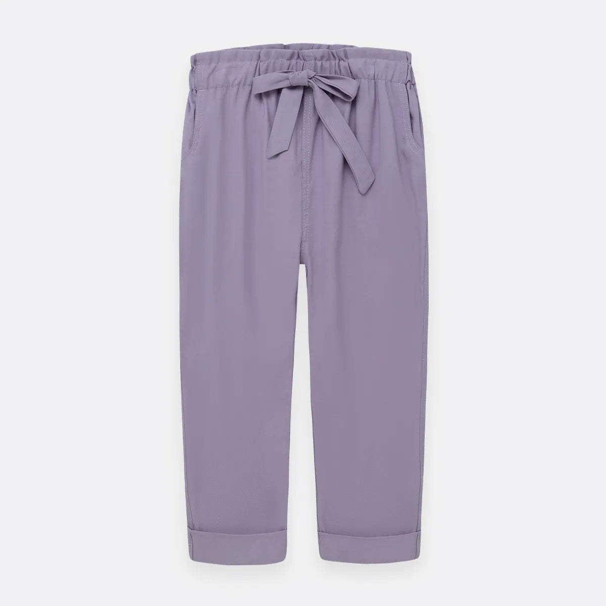 Pantalón en tejido plano silueta slouchy con cintura elástica, elástico ajustable interno y moño decorativo.