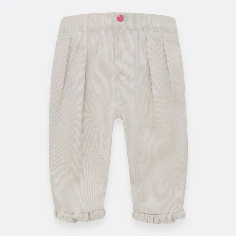 Pantalon para bebe en tela corduroy, tiene boleros en las botas, bolsillos traseros en forma de corazon color fucsia.Composición: 100% algodón, 90% poliéster, 9% poliamida, 1% elastano.