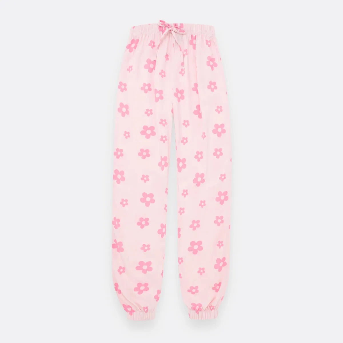 Pijama pantalón en tejido plano con cintura y botas elásticas, cordón ajustable.