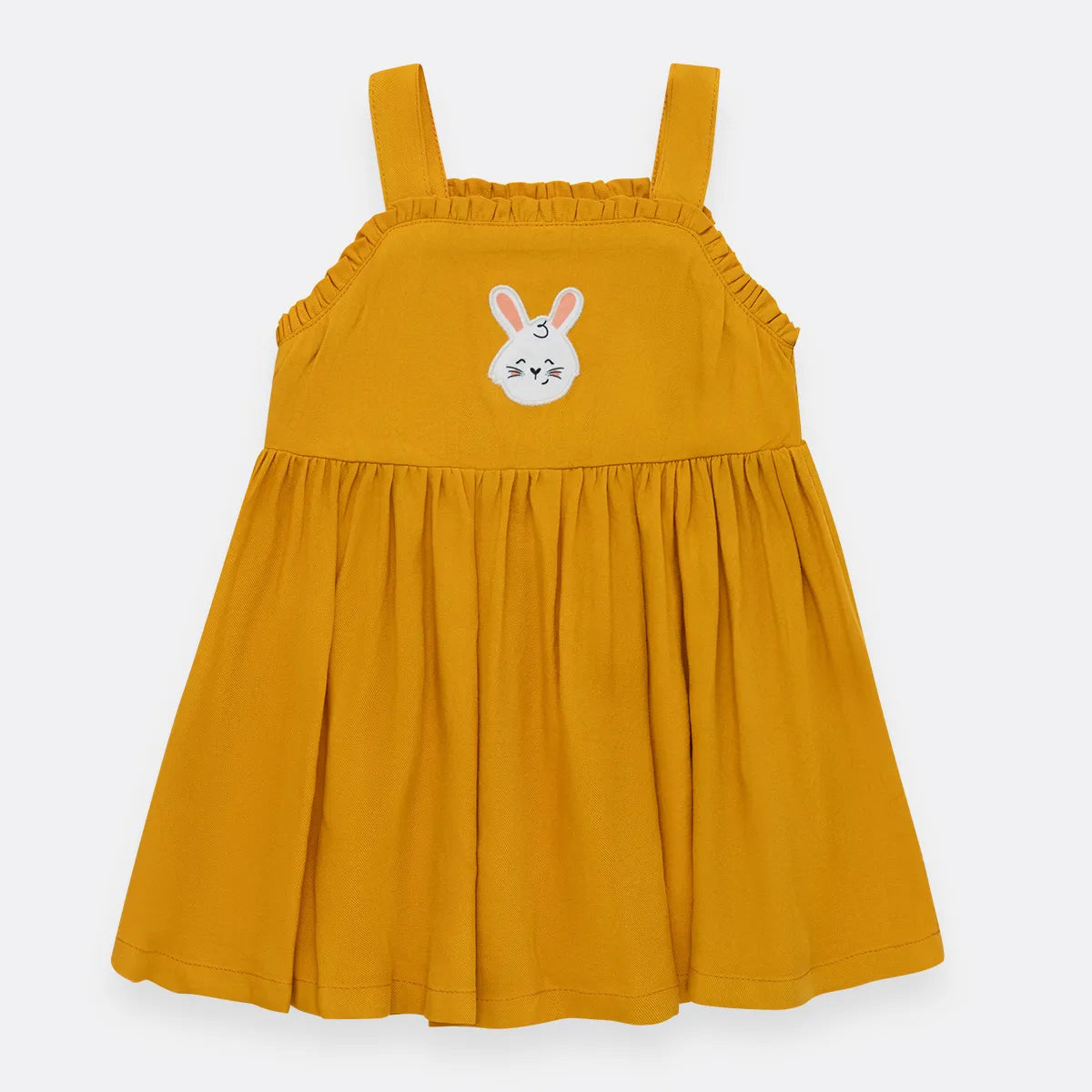 Conjunto de body manga corta en tejido de punto con pasadores en hombro + vestido en tejido plano silueta amplia con cargaderas ajustables, detalle bordado, color amarillo